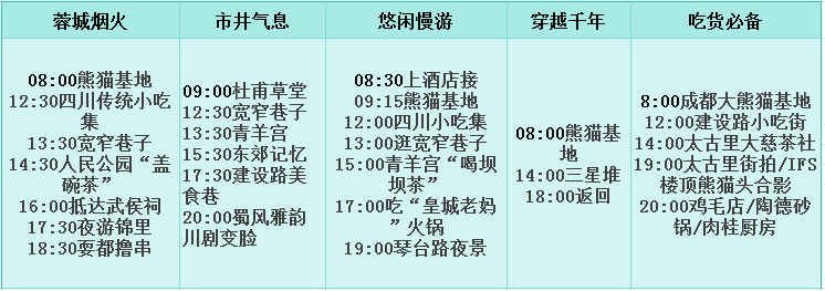 5.如您的时间充裕,可在自由活动时间前往游览成都文化地标(武侯祠、锦里、杜甫草堂、宽窄巷子、春熙路、太古里等)、品尝成都特色小吃(担担面、夫妻肺片、龙抄手、韩包子、钟水饺、三大炮、赖汤圆、九尺板鸭等)。