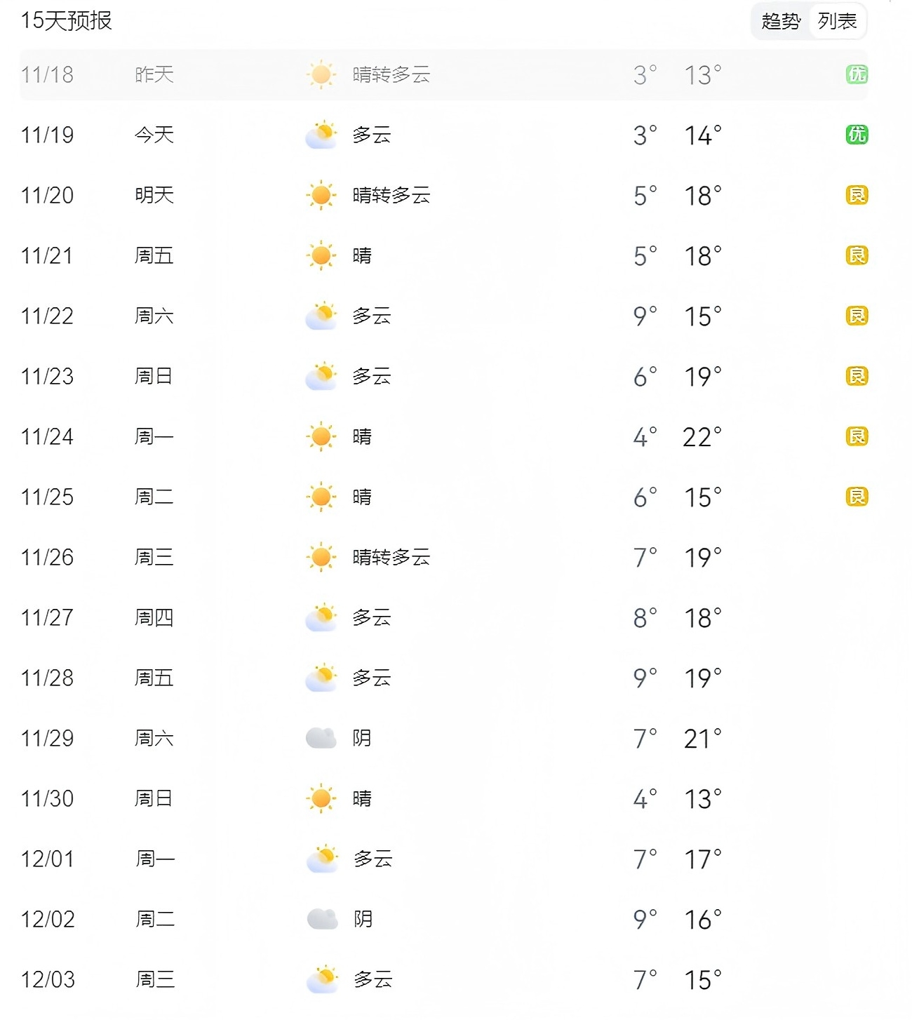 多云到晴;zui低气温0~3℃,zui高气温18~20℃。