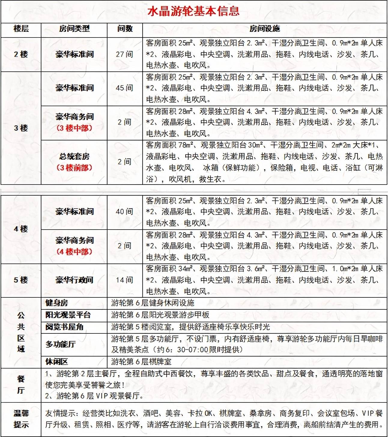 1、楼层安排及升级楼层:游客入住楼层为船方随机安排(基础楼层为2层),内宾升级楼层为150元/人/层(请自行前往游船前台申请或提前缴费预订办理),外宾价格现询;要求左旋或者右旋的房间+200元/间